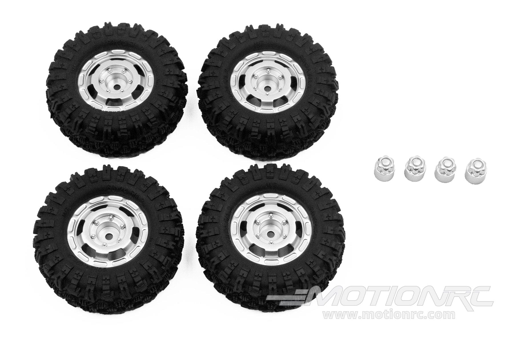 1/18 Scale CR18P Satin Silver Truck Wheel/Mudder Tire Set from Hobby Plus - HBP240460